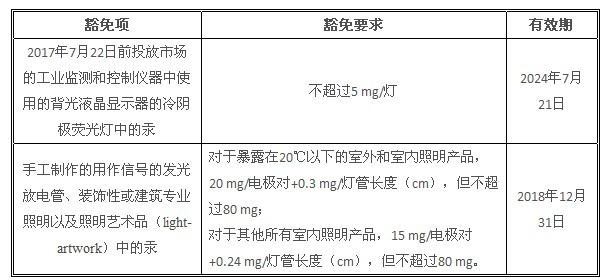 2014年5月20日,歐盟在其官方公報上正式發布了RoHS指令的八項豁免,其中與照明設備相關的豁免有兩項:
